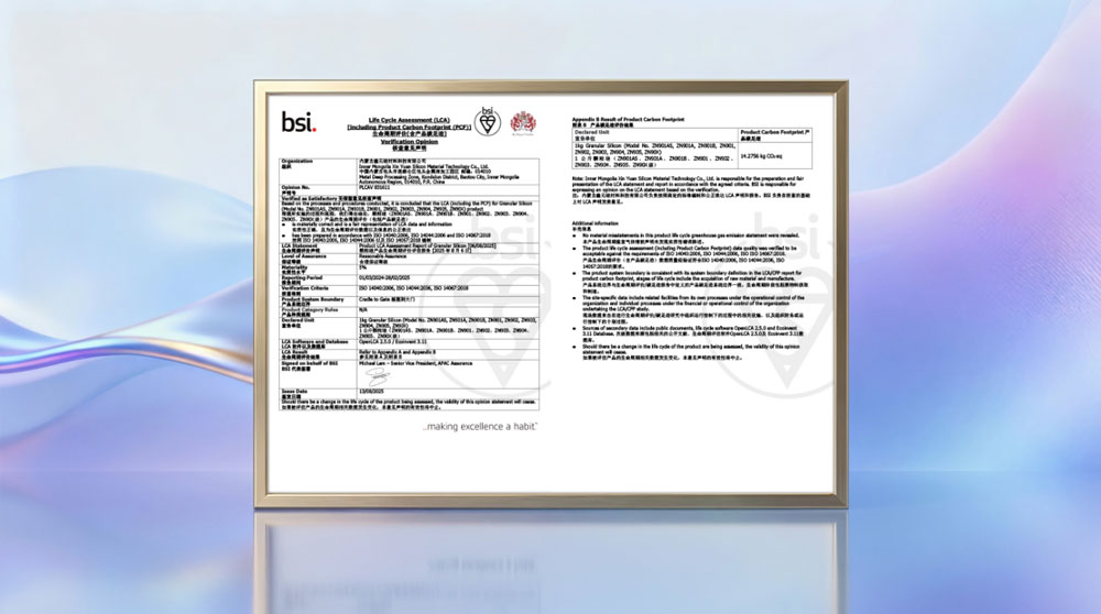 A GCL recebeu uma Declaração de Verificação de Avaliação do Ciclo de Vida emitida pela British Standards Institution (BSI), uma organização de certificação internacionalmente reconhecida, confirmando uma pegada de carbono do berço ao portão de 14,2756 kg de CO₂ equivalente por quilograma de silício granular produzido em sua base de Baotou.